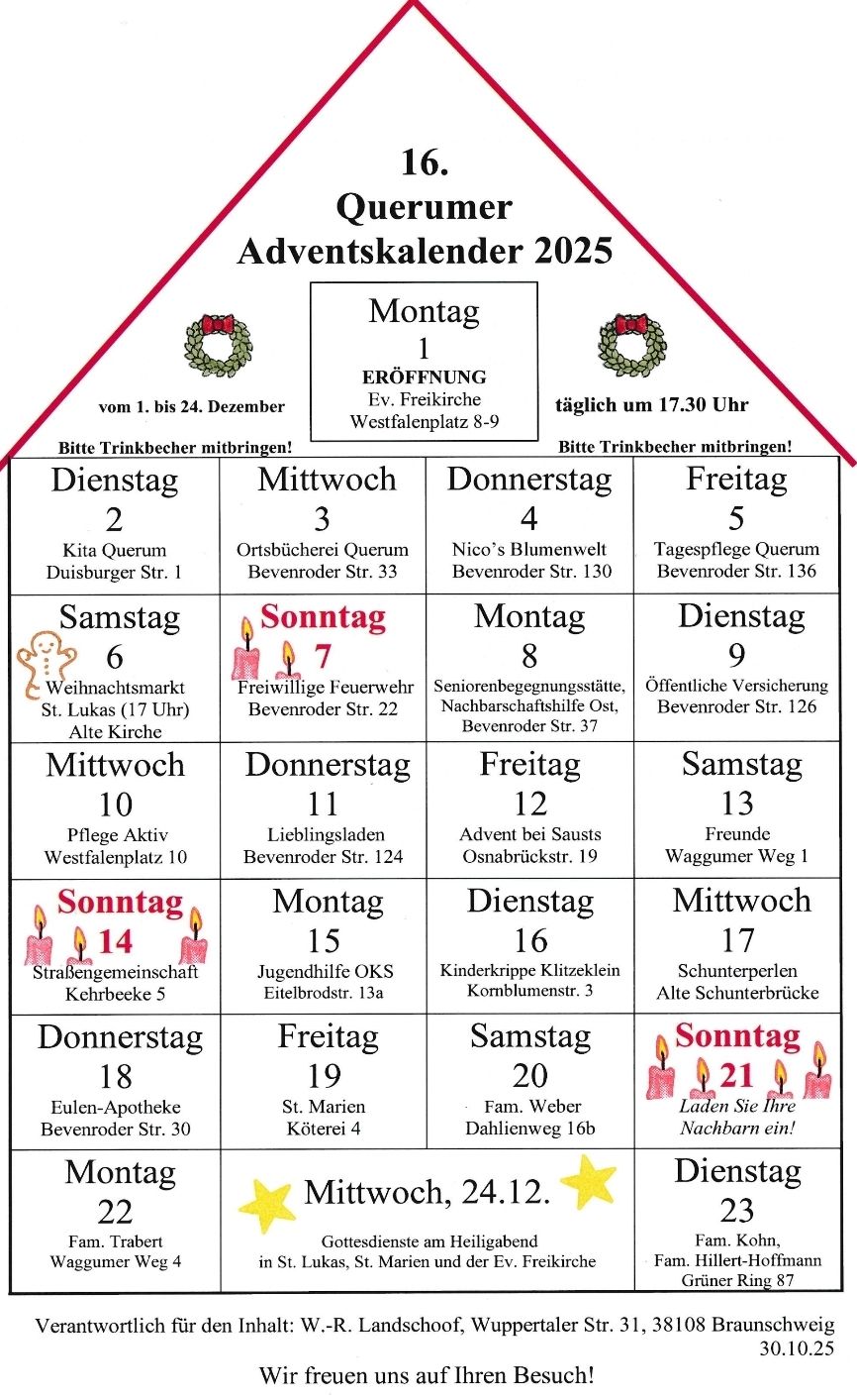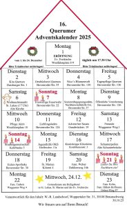 Vom 1. bis 24. Dezember öffnet sich in Querum jeden Abend um 17:30 Uhr ein neues „Türchen“ des lebendigen Adventskalenders. Verschiedene Einrichtungen, Gruppen und Initiativen gestalten kurze, liebevolle Begegnungsmomente mit Musik, Geschichten, Aktionen oder einem warmen Getränk.