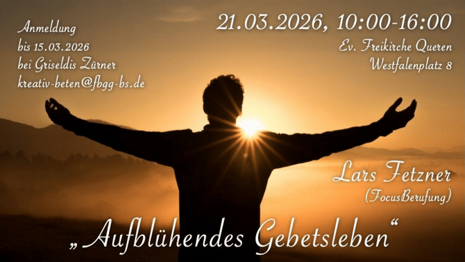 Am 21. März 2026 von 10:00 bis 16:00 Uhr findet in der Evangelischen Freikirche Querun (Westfalenplatz 8) ein inspirierender Seminartag zum Thema Gebet statt. Unter dem Titel „Aufblühendes Gebetsleben“ lädt Lars Fetzner (FocusBerufung) dazu ein, das persönliche Gebetsleben neu zu entdecken, zu vertiefen und frische Impulse für den Alltag mit Gott zu gewinnen.