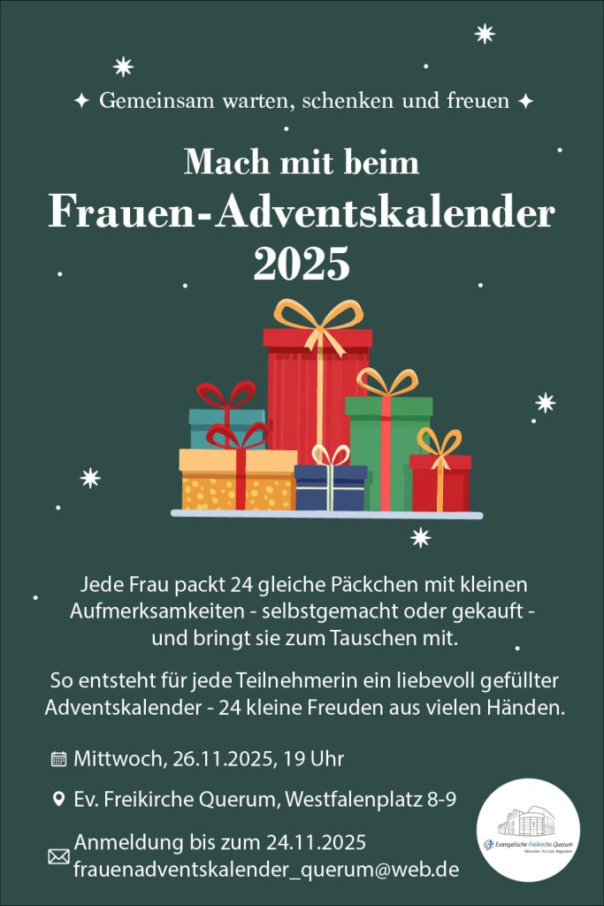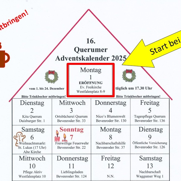Wir laden herzlich zur AuffĂŒhrung unseres fröhlichen und bunten Kinder-Musicals âFreude, Freudeâ ein!Die Kinder haben wochenlang geprobt und freuen sich darauf, ihre Geschichte voller Musik, Bewegung und groĂer Begeisterung auf die BĂŒhne zu bringen. Sonntag, 14. Dezember 2025Beginn: 15:30 Uhr â Einlass: 15:00 UhrEintritt frei Im Anschluss sind alle zu Kaffee, Kuchen und Keksen eingeladen […]