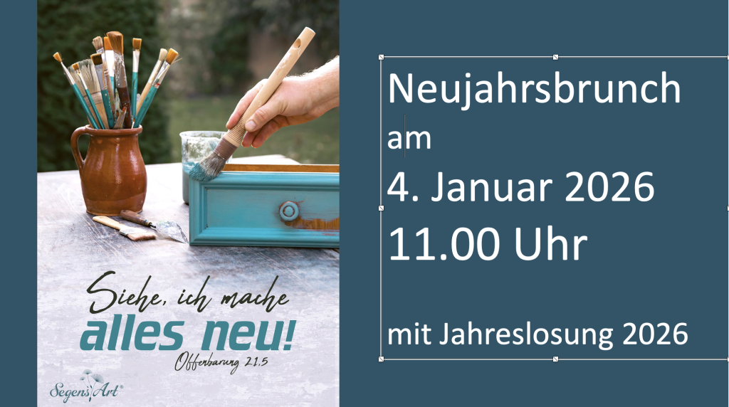 Gemeinsam das neue Jahr feiern, mit leckeren Köstlichkeiten, sich in das neue Jahr einstimmen mit der Jahreslosung – darum treffen wir uns zum Neujahrsbrunch!. Jeder und jede ist herzlich eingeladen. Da wir immer ein sehr vielfältiges Buffett haben, wenn jeder etwas mitbringt freuen wir uns über deinen Beitrag. Aber auch solltest du nichts mitbringen können, […]