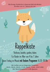 Die Evangelische Freikirche in Querum lädt alle Kinder im Alter von 4 bis 7 Jahren herzlich zur „Rappelkiste“ ein!